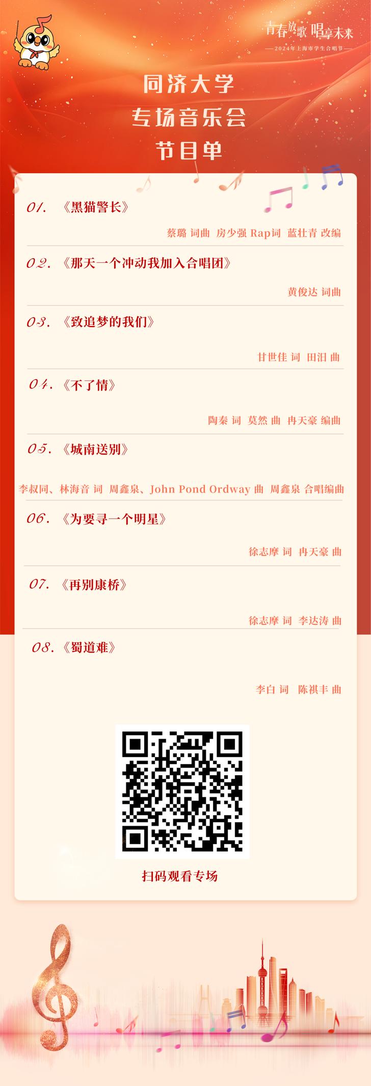 同济大学此次共提交了《黑猫警长》《致追梦的我们》《城南送别》《再别康桥》《蜀道难》《那天一个冲动我加入合唱团》等8首曲目,分别包含了经典合唱作品、新编合唱作品和原创合唱作品。从中国古典词作到现代诗歌、从传统合唱学习到现代和声运用,这些作品不仅蕴含着深厚的文化底蕴,也体现出合唱艺术的魅力与创新精神,尽显踔厉奋发的青春风采。
