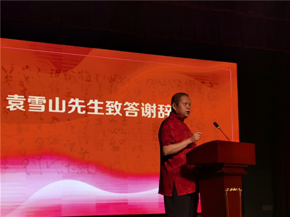 在开幕式致答谢辞环节,袁雪山先生深情回顾了自己的书法学习道路。“在我学书过程中,有两位老师不会忘记,一位是王劲父老师,他带我入了门,教我从晋唐入手兼带宗元,使我从此走上正道。第二位是张森兄长,在我20多岁时他给我讲了一笔,示范给我看,就是中锋用笔,这一笔太重要了,学了这一笔,我终身活用,并在我的书法中起到了主梁骨的作用,受益一生。”