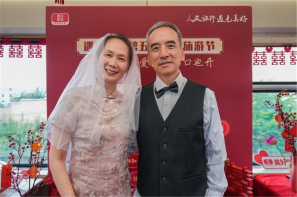 此次旅程别出心裁,主持人化身“月老”牵线搭桥,车厢内弥漫着温馨浪漫的氛围。活动在“玫瑰情话签到”中拉开序幕,每位旅客手持玫瑰在主题墙上留下爱情寄语,瞬间点燃了全车的浪漫气氛。本届火车旅游节精心设计了三大情感体验环节,让爱与表达贯穿旅程始终:一是在“爱的交换仪式”现场,男士们郑重地为伴侣披上洁白头纱,女士们则为对方系上领结,交换爱意。