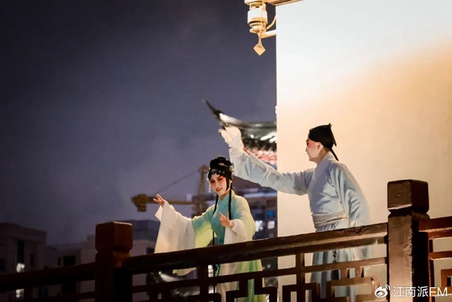 沉浸式昆曲《浮生六记·海上版》就是依据豫园商城里的场景定制改编而成的演出作品。主戏台海上梨园是豫园商城的“空中会客厅”,国风建筑、亭桥湖光、脊兽匾额融合其中,幻化成园林、菜市、灯会。全剧从豫园湖心亭开启,观众由舞者带领从九曲桥上穿越到海上梨园露台,欣赏沈复和芸娘在眼前低吟浅唱。海上梨园副总经理王平表示,《浮生六记·海上版》演出场场爆满,能持续不断的进行驻场演出,说明市场反馈良好,而且它的票价也已经达到了戏曲演出的天花板。