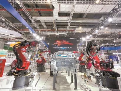 将在工博会上展示的新松公司白车身点焊机器人工作站。 吴丹璐 摄