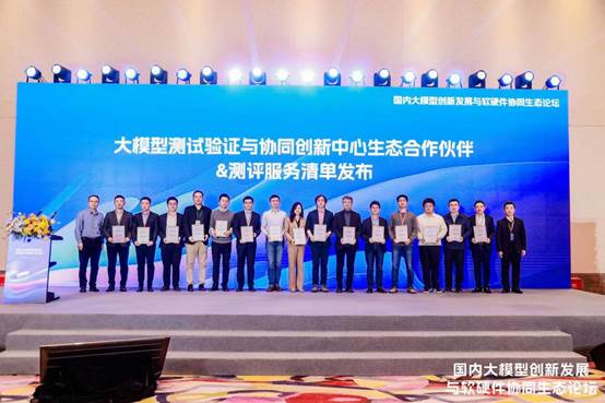 中国信息通信研究院人工智能研究中心常务副主任魏凯和上海人工智能实验室主任助理、领军科学家乔宇共同发布了大模型测试验证与协同创新中心生态合作伙伴及测评服务清单,并为中心的第一批生态合作伙伴颁发证书。
