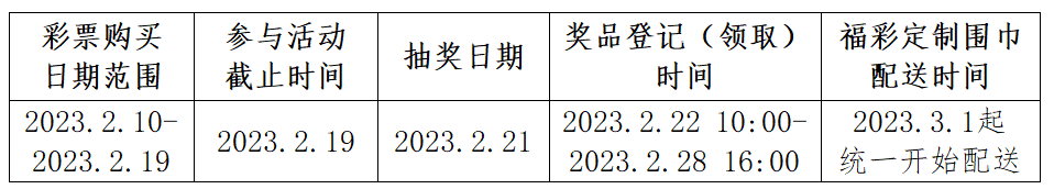 活动抽奖结束后,京东E卡中奖通知将于2月22日通过手机短信方式发送至中奖者,中奖者须在2月22日上午10点-2月28日下午16点至上海福彩官方微信公众号奖品领取页面兑换京东E卡,未能如期完成兑换的,视为弃奖。福彩定制围巾中奖通知将于2月22日通过手机短信方式发送至中奖者,中奖者须在2月22日上午10点-2月28日下午16点至上海福彩官方微信公众号查询及登记领奖页面,输入入围登记的手机号码,经验证后填写收货地址信息(仅限上海地区范围内配送),确认完成登记领奖,奖品将于3月1日起统一开始配送。未能如期完成登记的,视为弃奖。