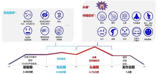 偏头痛的临床表现可以分为前驱期、先兆期、头痛期和恢复期。这些时期的症状可能会有重叠,有些病人可能只有其中的一部分症状。下图为各阶段的持续时间及临床表现: