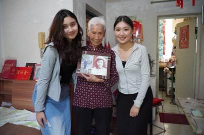 实践团队成员与采访对象第十二师二二二团老军垦宫翠英合影