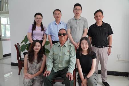 实践团队一行人在新疆生产兵团第六师干休所与采访对象郑志义老党员合影