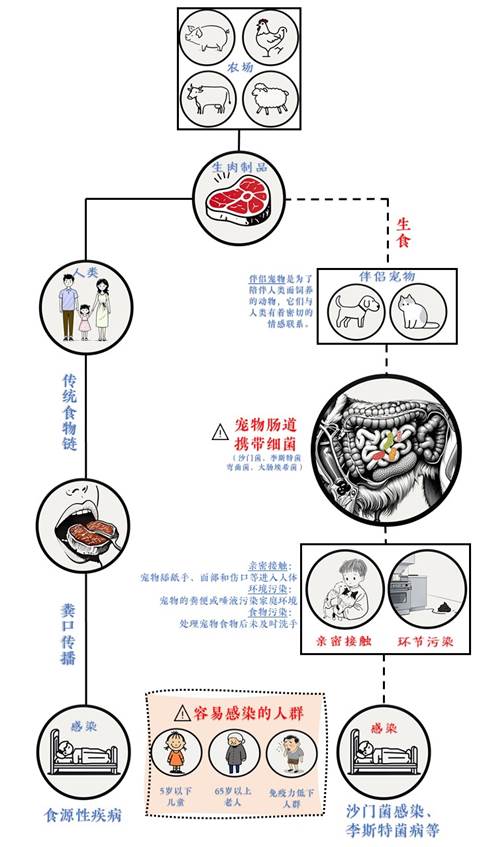 ·食品污染:宠物食用生食后,可能在家中其他食品表面留下致病菌,导致交叉感染。如果主人在处理宠物食品后未及时洗手,致病菌也可能通过食物感染人体。