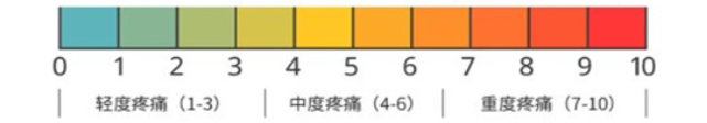 1、疼痛数字评定量表[3](Numeric Rating Scale, NRS)将疼痛程度分成0到10共11个数字组成,病人从这11个数字来描述疼痛程度,0表示无痛,1~3为轻度疼痛(疼痛不影响睡眠),4~6为中度疼痛,7~10为重度疼痛(不能入睡或睡眠中痛醒)。
