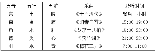 5、五行音乐疗法依据中医五行体系,五种旋律——宫调、商调、角调、徵调、羽调,分别象征着土、金、木、火、水五大元素,它们与人体五脏六腑之间建立起神秘而深刻的联系:脾(胃)共鸣于悠扬的宫调;肺(大肠)沉醉于清越的商调;肝(胆)随律动的角调起舞;心(小肠)沉浸于热烈的徵调;而肾(膀胱)则被深邃的羽调所抚慰。尤其值得注意的是,选择合适的时间节点聆听五音,可令其疗愈效能倍增。当人们沉浸在这些旋律之中,五音不仅有助于缓解肉体上的疼痛,更能抚平心灵的创伤,提振精神面貌[9]。