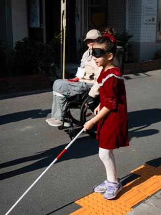 带着眼罩的参与者正在体验微缩盲道迷宫 摄影 温迪、大禾