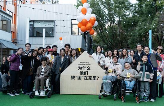 在展览的最后互动环节,当日所有的现场参与者汇集到草坪的中央,艺术装置所在之处。大家把写满了关于“究竟是什么把他们困在了家里?”的答案与祝愿的气球悬挂在木房子装置的最顶端。策展人木林霏在现场分享:“只有我们把对于问题的关注与思考继续进行下去,当关于答案气球足够多的时候,象征着障碍的房子才终有一天能被被‘放飞’,困在房子中轮椅也才能够自由地去往任何地方”。