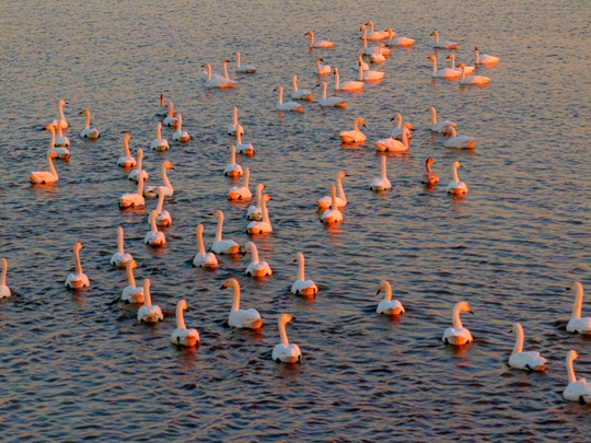 登临骆山,可触摸到百年古树斑驳的纹理,也可聆听山中古寺袅袅禅音。山顶远眺,水光潋滟,石臼湖盛景尽收眼底。我睁大眼睛,追随远处天空中的小白点,一群一群的天鹅飞来了。睁大双眼盯着看,小白点越来越近,变成了飘飞的云朵,悠悠地迎着霞光染红的湖面飞来。最前面的一对天鹅飞临湖面,如仙女下凡,那娇美的姿态仿佛轻云蔽月,飘逸似流风回雪,恰如湖上朵朵盛开的白莲花,在湖中不停舞蹈,身姿清秀,雪翅洁白,身段秀美,透着神奇的魅力。