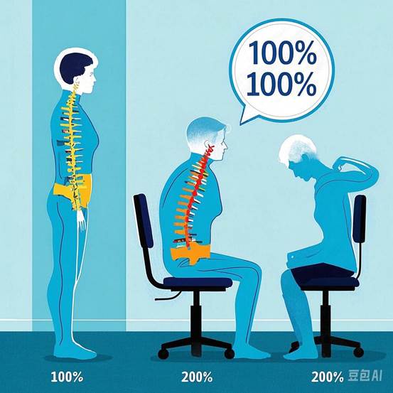 脊柱承受的压力随着身体不同的姿势呈现梯度递增:站立时为100%体重负荷,静坐时腰椎压力骤增至150%,若坐姿不佳甚至弯腰驼背则压力可达250%。