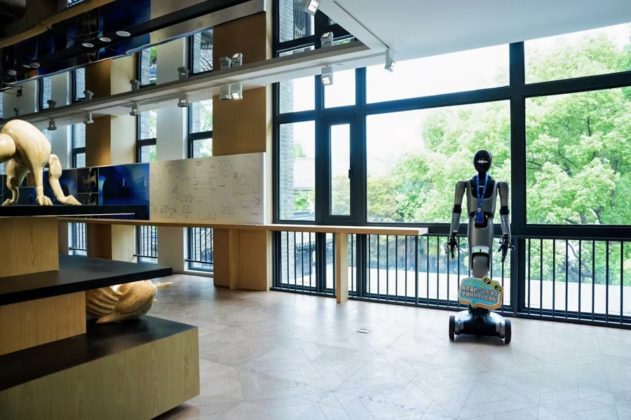 5月18日,上海复旦艺术馆开馆首展“日月复光华”迎来一位特殊的迎宾员——擎朗人形具身服务机器人XMAN-R1。它身形修长优雅,线条流畅,以1:1人体黄金骨架比例塑造,每一处关节都暗藏人体工程学的智慧。当它微微屈膝向观众致意时,仿佛一位来自未来世界的使者,正引领人们走进艺术与科技交融的殿堂。