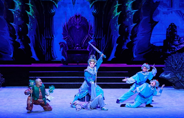 蒲剧《精卫填海》是出“文武融合”的大戏,主演梁静是山西省临汾市小梅花蒲剧艺术培训中心一级演员,曾获“小梅花金奖”榜首、“杏花表演奖”、“中国戏曲红梅荟萃”金花十佳、“全国地方戏精粹展演表演艺术传承英才”等诸多荣誉。作为领衔主演,工刀马旦的梁静在创演团队共同配合下,突破性完成“花旦—闺门旦—刀马旦”的跨行当演绎。剧中,她既是个与父母相依相念的乖女儿,也是个和海王勇猛对决的侠义客,她还是个对百姓心存怜悯的好神仙。不同的场景需要梁静随剧情迅速调整不同的扮角定位,在文武戏间快速切换,梁静以深厚的戏曲功底应对裕如。让观众看得过瘾的是精卫激战海王那出,梁静在剧中尽展刀马旦飒爽英姿,先有日月双剑齐挥舞,袍袖旋飞似铁盾;再有棍棒利刃踢长枪,招招式式真功夫。梁静娴熟的串翻身、叉步、翎子功、飞跪等蒲剧表演技巧,赢得观众阵阵喝彩,掌声不绝。外行看热闹,行家看门道,对梁静而言,把擅长的刀马旦演到极致或非难事,而要在情意绵长的花旦戏中同样出彩则有不小的挑战。梁静是以极高的敬业精神和专业素养,在著名戏曲表演艺术家的指导下,每一个动作、每一段唱腔,反复再反复,复盘再复盘,以求尽美尽善。开场戏,炎帝夫妇与小精卫话家常,梁静以闺门旦的行当出场,以清脆而富韵味唱腔和曼妙的水袖舞姿把个小女儿的娇嗔和任性演绎得生动活泼,营造出一派亲情和睦的景象。悲情的一幕,是精卫与炎帝、炎后离别的那一节,既要流露出羽化成鸟的精卫与家人的惜别之情,又要展现精卫誓灭海王,为民除害的决心。梁静是以青衣所擅长的细腻肢体动作相伴一大段唱如泣如诉的演唱,将这一段复杂的情感和决绝的信心演绎得淋漓尽致,令观众不由为之动容,击节叫好。
